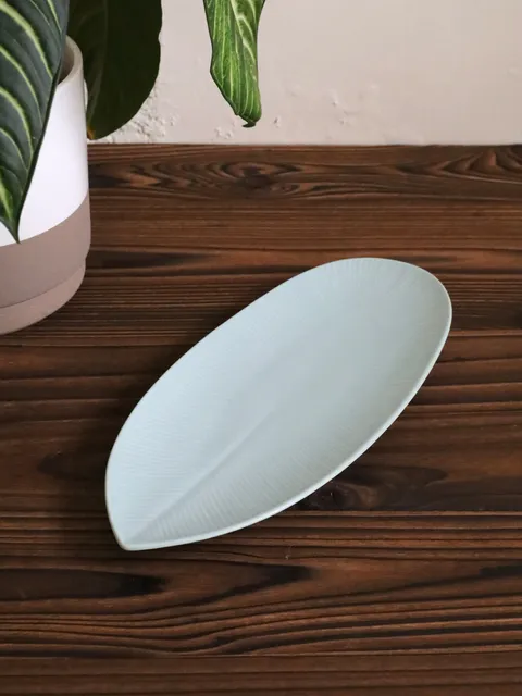青灰細彩 刻紋 橢圓皿